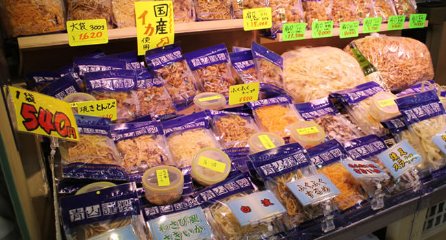 青山さんによると、イカ専門の乾燥珍味を直売する店は、函館朝市の中で「マルイチ青山水産」が初めてとのこと。函館市のお隣・北斗市の自社工場(「一印 青山水産」)で、イカの処理から珍味製品までの一貫生産の体制を持っている青山水産だからこそ、新鮮なイカで作った乾燥珍味を、お店を訪れた人にスピーディーに届けることができます